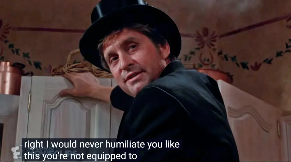 The Wars of the Roses Dinner Party – Barbara Rose (Turner) says to Oliver Rose (Douglas) “I would never humiliate you like this”. His response: “You’re not equipped to”. Classic scene from the film showing men have a ‘means’ women don’t, therefore men are the ‘master’. Scene from Youtube.